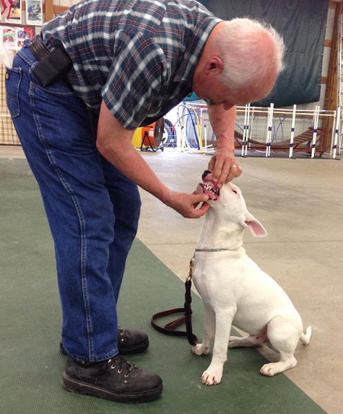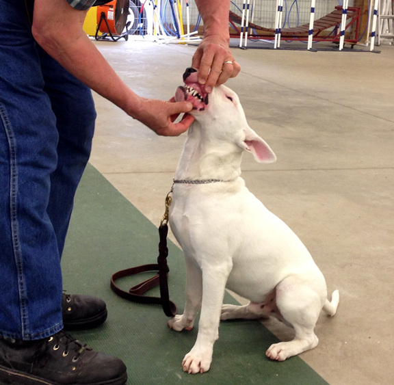 In our basic classes we  prepare dogs for the American Kennel Club’s Canine Good Citizen test.  Examining the dog’s teeth is one of the test steps in the exam.  This step also tests the dog’s understanding of the ‘stay’ command — sit and remain in place.  Use the ‘Contact Us’ tab to ask questions or discuss training issues.