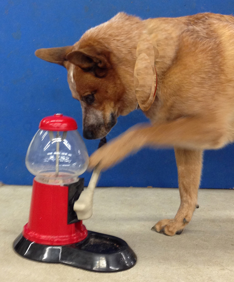 Teaching your dog tricks engages their mind. One can accomplish a lot of training objectives through games and other tasks. In the process, you’ll have lots of fun, too. The foundation is helping the dog learn to pay attention, do as you say, and stay on task. Tricks help the dog focus on you and what you want. At the left, Rusty delivers a dog treat from the vending machine when he presses the handle.