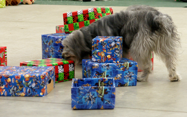When  your dog gets ‘in trouble’ at home, it is often because the dog doesn’t have enough real work to do and is trying to keep herself/himself occupied.  One can curb lots of this ‘nuisance’ behavior by giving your dog a job to do.  In this example, Ace is assigned the task of finding his toy among the presents — putting his super sense of smell to work.  Use the ‘Contact Us’ tab to ask us for other tips about keeping your dog engaged.