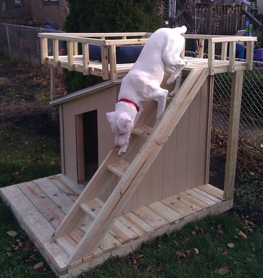This site includes the list for shopping and tools you will need and and step-by-step instructions with photos on how to build your dog’s own agility course. And here are instructions for building the doghouse with roof-top veranda and stairs to give the dog exercise going up and down.