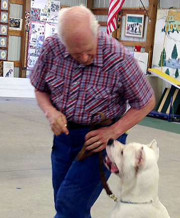 From the first class session, we help you get your dog’s attention.  Getting your dog to pay attention to you often starts with your paying close attention to your dog. Attend to your dog intensely early in training, and your dog will begin to pay attention to you, too.  The picture is an example of that two-way attention.  Your goal will be to build  your dog’s habit of paying attention to you even in the midst of lots of distractions – noises, other dogs, rabbits and squirrels, other people, etc.  The first step is your paying close attention to the dog.