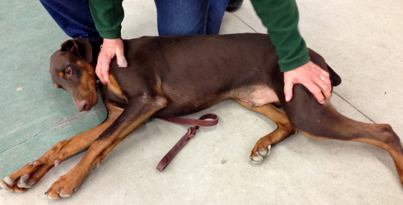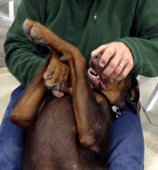A must exercise for early in training is the ‘individual daily exam.’ Do it if you had time for no other training activity. When the dog wiggles in this position, correct. When the dog is quiet, praise. The exercise teaches your dog who is in charge, demonstrates the dog’s trust in you, enables you to examine the dog for health issues, introduces your dog to grooming, reduces the probability of a dog bite by handling the dog’s mouth and feet, teaches your dog time-on-task behavior. After you complete the daily exam, put your dog in the position we call ‘relax’. Examine the dogs parts in this position, too. These exercises lay the foundation for excellent visits to the vet. Your dog becomes accepting of having its parts examined.